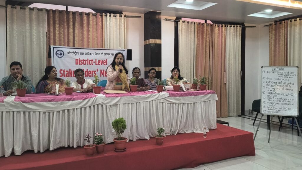 अंतर्राष्ट्रीय बाल अधिकार दिवस के उपलक्ष्य में आदर्श सेवा संस्थान एवं रूरल डेवलपमेंट एसोसिएशन के संयुक्त तत्वावधान में जिला स्तरीय स्टेकहोल्डर्स’ मीटिंग का आयोजन होटल कैनलाइट, साकची में किया गया। कार्यक्रम में मुख्य रूप से पूर्वी सिंहभूम जिला विधिक सेवा प्राधिकरण के सचिव धर्मेंद्र कुमार, जिला समाज कल्याण पदाधिकारी संध्या रानी ठाकुर, जिला बाल संरक्षण पदाधिकारी प्रेम प्रकाश, जुवेनाइल जस्टिस बोर्ड के सदस्य सुधीर कुमार, आदर्श सेवा संस्थान की सचिव प्रभा जयसवाल, रूरल डेवलपमेंट एसोसिएशन से सुजॉय भट्टाचार्या, बाल कल्याण पुलिस पदाधिकारी (सोनारी थाना) परेश राजवार, अन्य पुलिस पदाधिकारी, विभिन्न सिविल सोसायटी संगठनों के सदस्य, पीएलवी सदस्य, घाटशिला ग्रामीण क्षेत्र से युवा साथी तथा जमशेदपुर अर्बन के युवा साथी उपस्थित रहे।